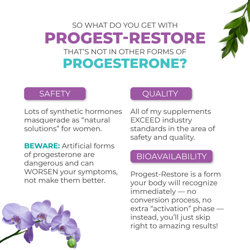 With Progest-Restore, you can rest easy knowing you're taking the highest-quality, safest, and bioavailable progesterone in the marketplace.